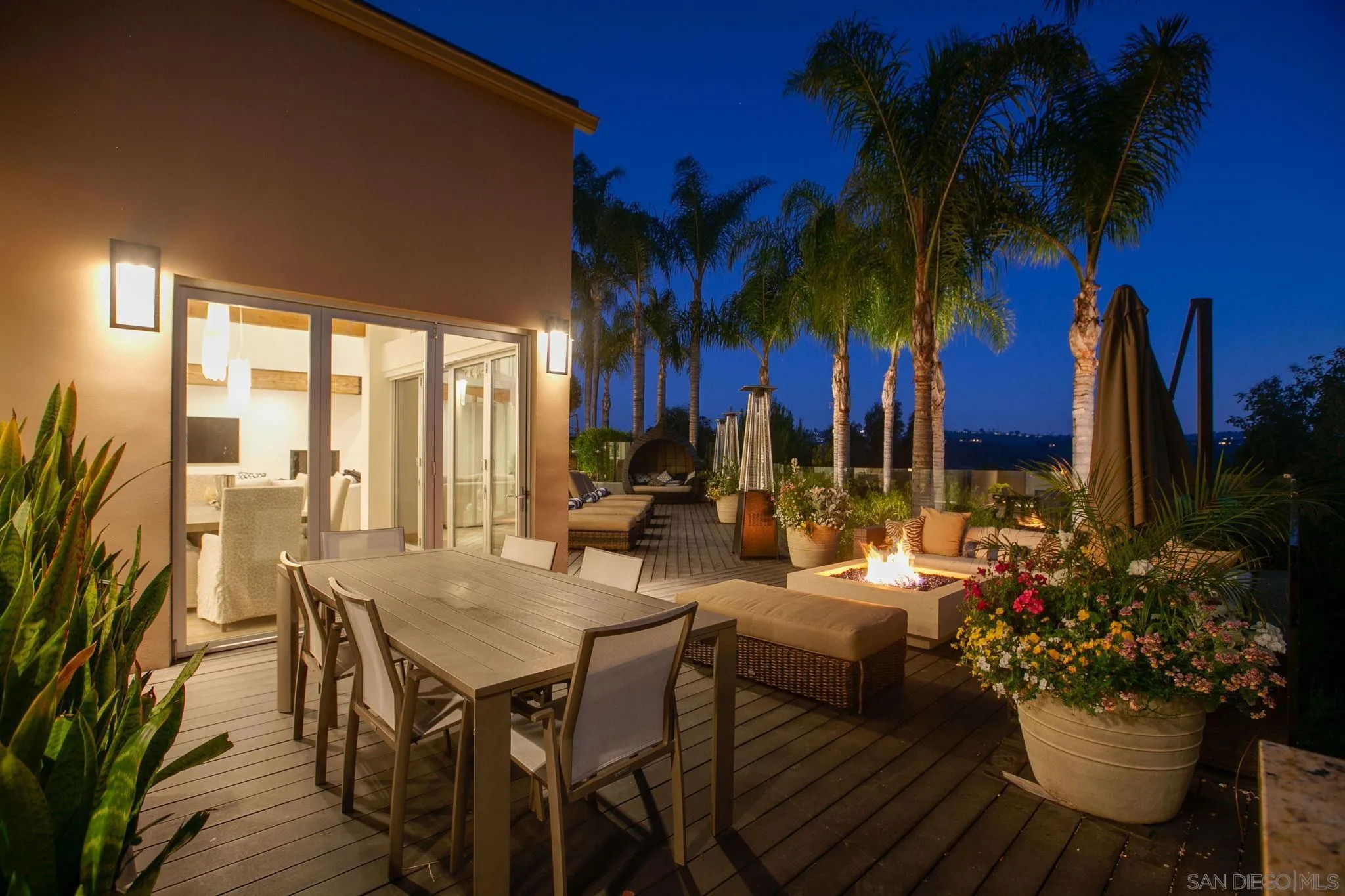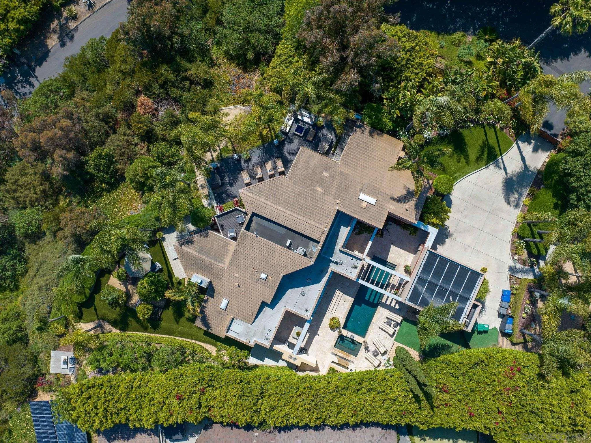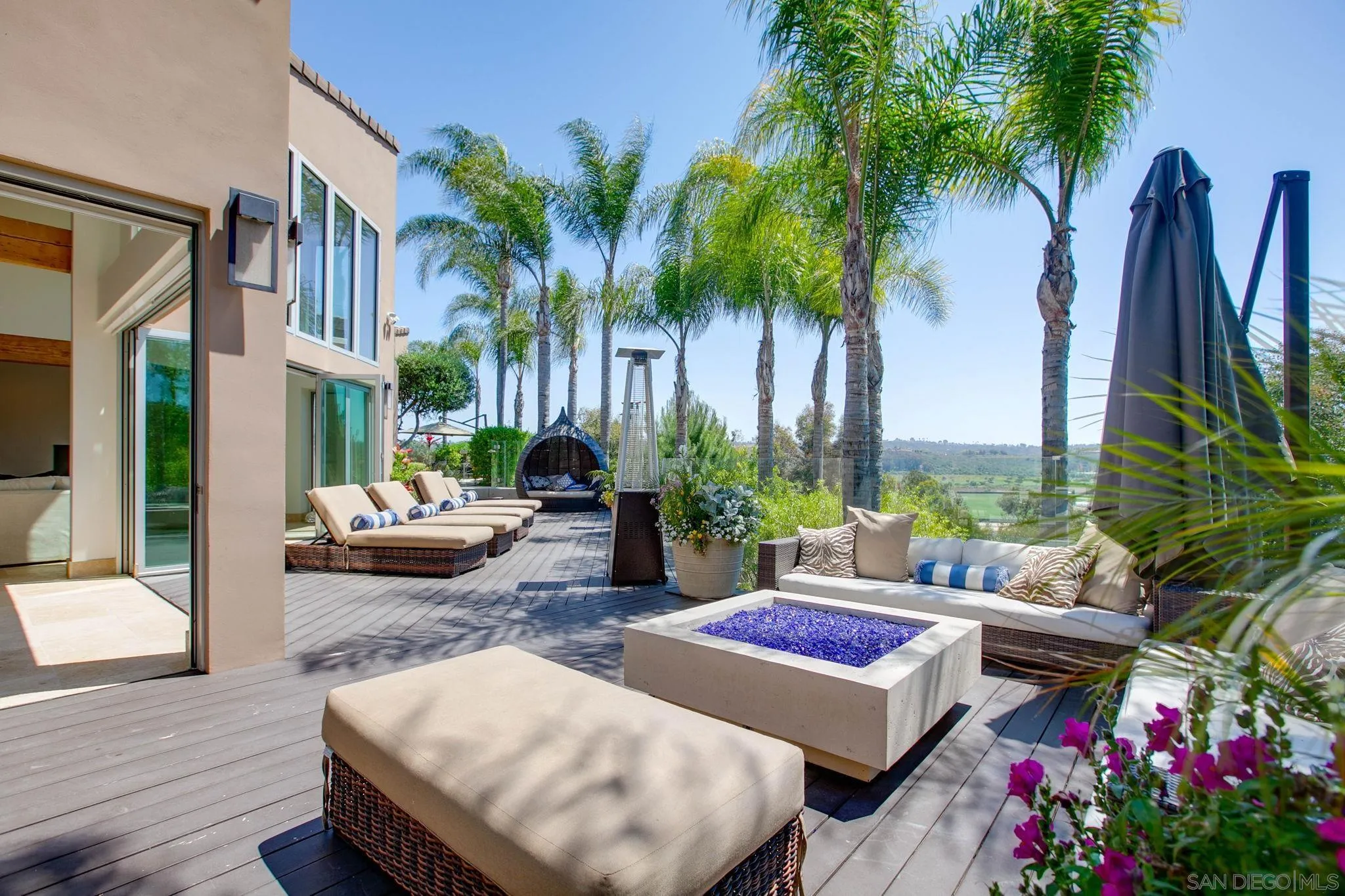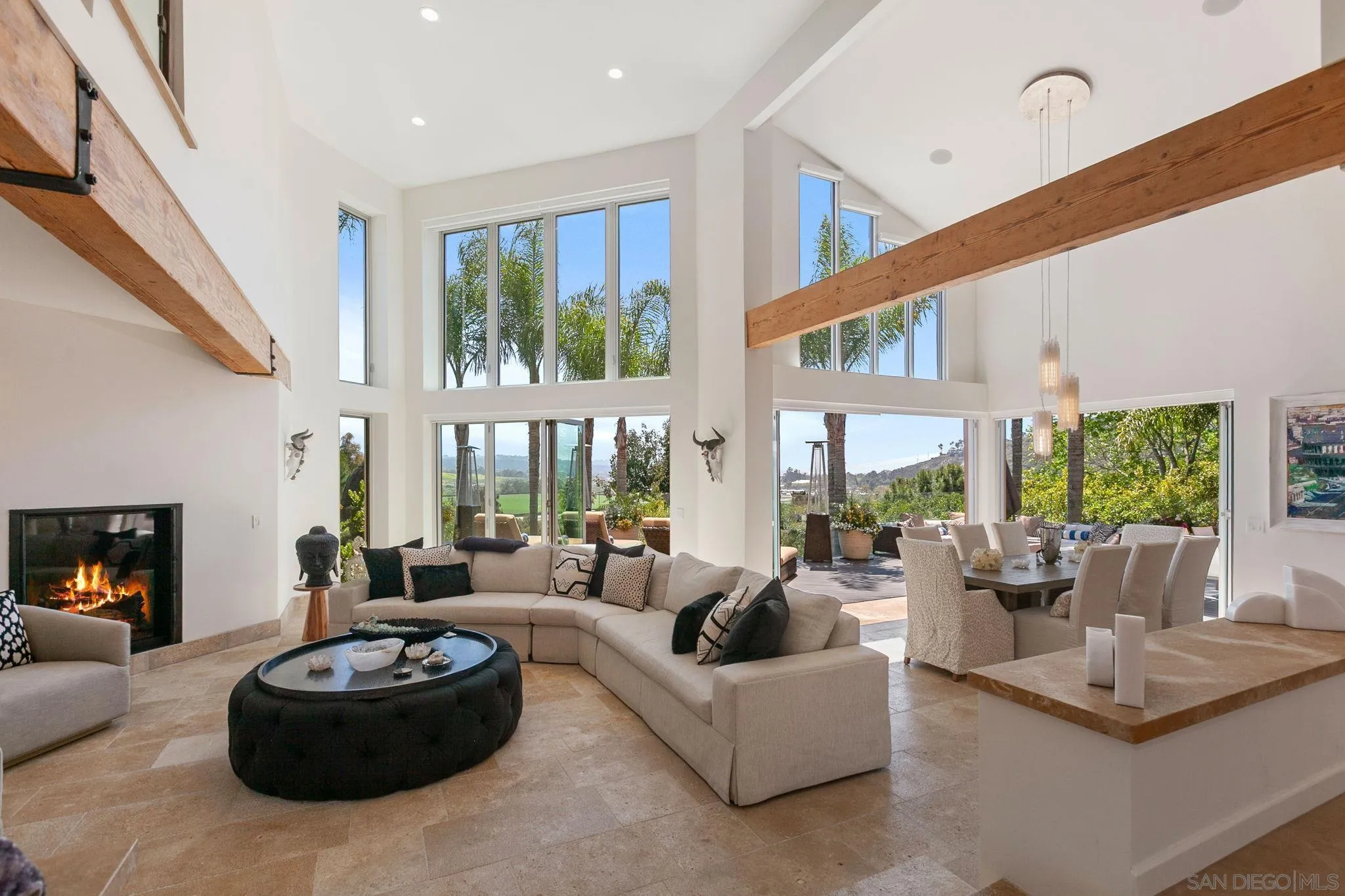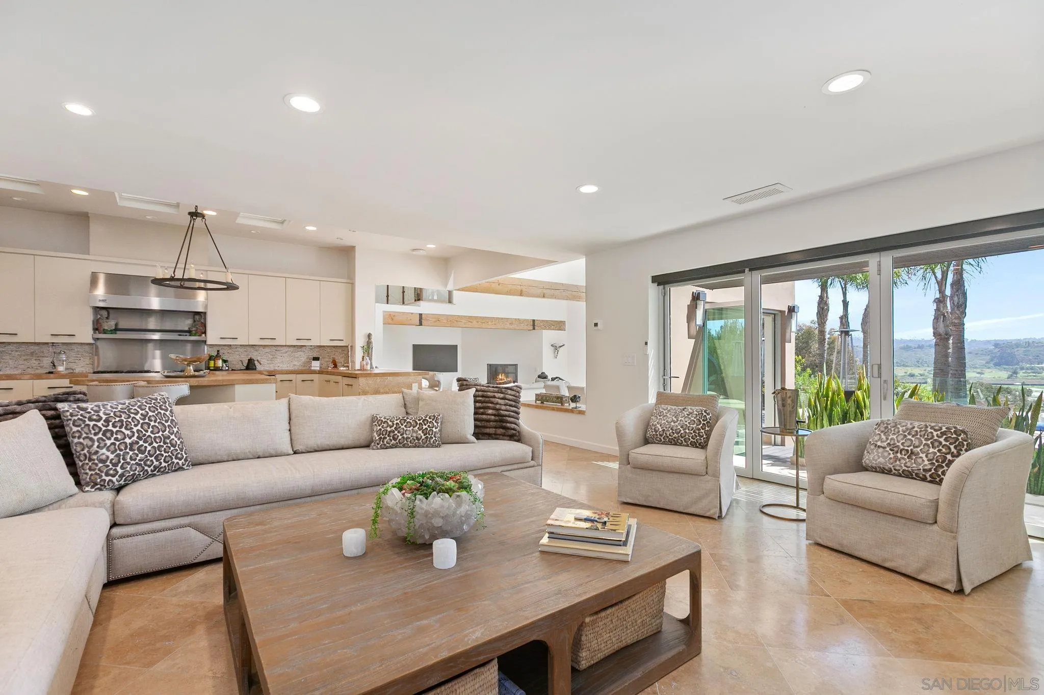 Welcome to 14817 Arroyo Rosita - a luxurious, resort-style contemporary home nestled in one of Rancho Santa Fe's most coveted and private enclaves. Perched on one of the most Westerly streets in the community, this exceptional property offers panoramic views over the Del Mar Polo Fields and out to the Pacific Ocean. Meticulously upgraded with over $300,000 in recent enhancements, this home now features a state-of-the-art sound, lighting, and security system, delivering unparalleled comfort, convenience, and peace of mind. Smart home technology powered by Door Bird, Apple TV, Screen Logic (pool control) and Sonos offers full control at your fingertips. Inside, soaring cathedral ceilings and bi-fold glass doors create a seamless indoor-outdoor flow from the expansive great room to the private deck and entertainer's dream backyard. The chef's kitchen is outfitted with top-tier Viking and Sub-Zero appliances, while elegant Travertine and wood flooring add warmth and sophistication throughout. The luxurious primary suite boasts a custom walk-in closets, private garden patio, dedicated office, and spa-style bath complete with sauna. Outdoor living shines with a sparkling pool and spa with a tranquil waterfall feature, built-in BBQ, pizza oven, and surround sound - all perfectly positioned to enjoy breathtaking sunsets and ocean breezes. Located on a gated street, and just a short walk to the renowned Market restaurant, this home sits at the crossroads of Rancho Santa Fe and Del Mar - offering the best of both worlds in location and lifestyle. Potential for an ADU.