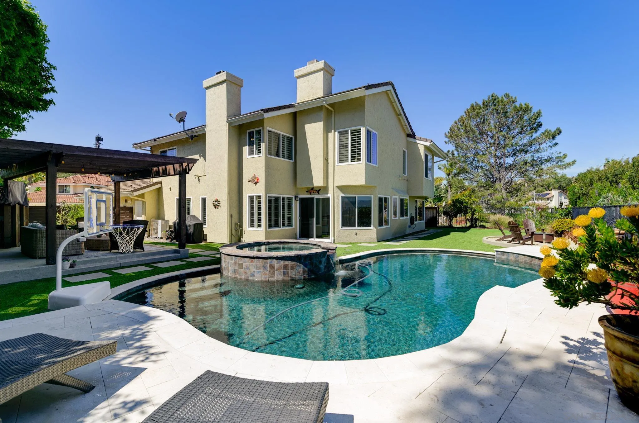Striking hilltop location in the Terraces at Cantebria with panoramic hillside and mountain views, this beautifully upgraded home offers the perfect blend of comfort, style, and functionality. Thoughtfully renovated inside and out, the property features a newer roof, owned solar, fresh interior and exterior paint, and a fully reimagined outdoor setting with paver driveway and walkways, new landscaping, turf, irrigation, and landscape lighting. The backyard is a true retreat, complete with a stamped concrete patio, pergola, fire pit, putting green, planter beds, and a modern Pebble Tech pool and spa with river rock accents--ideal for entertaining. Located just a few minutes to the beach, this home is true California living at it's finest. Inside, the home is bright and inviting with gorgeous hardwood floors, designer paint, shutters, recessed lighting, dual pane windows and sliders, central air, and a whole house fan. The updated kitchen is complemented by upgraded appliances, while fireplaces in both the family room and primary suite add warmth and character. The recently renovated primary suite features a spa-like bathroom with soaking tub, custom shower, new dual vanity, all-new floor and wall tile, updated lighting and plumbing fixtures, and custom California Closets. Additional highlights include a One Water system, upgraded insulation, newer water heater, epoxy garage floors, and a spacious 3-car garage. Residents enjoy access to community pool, spa, and tennis courts, all just moments from shopping, dining, and everyday conveniences in the heart of Encinitas.