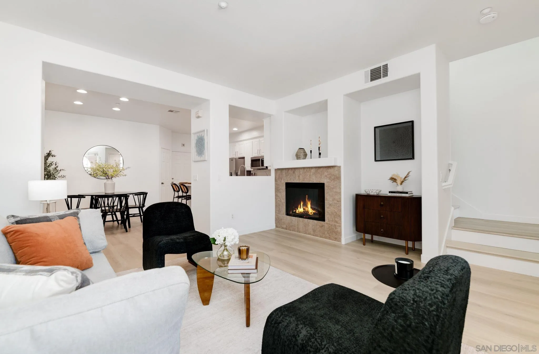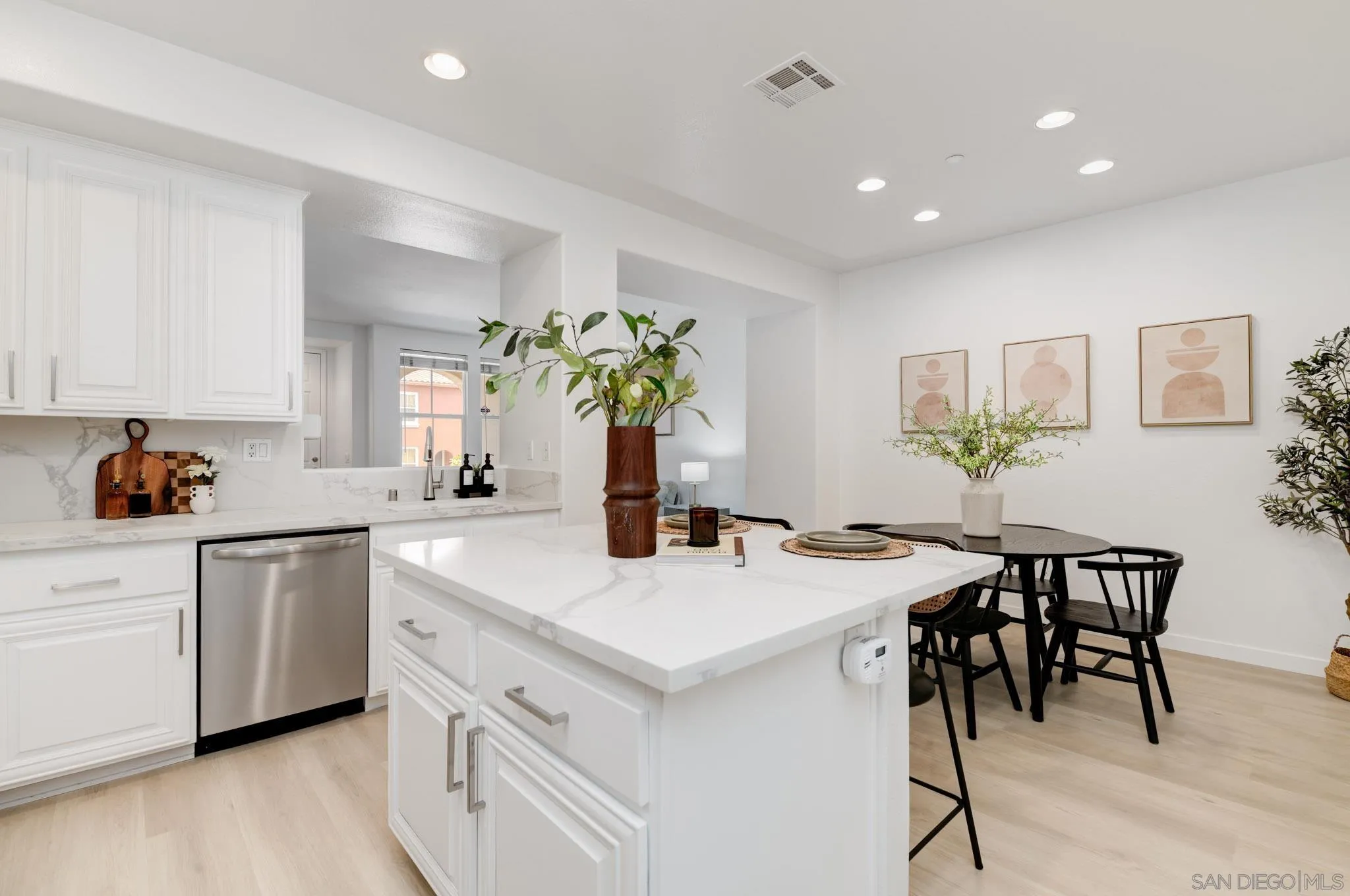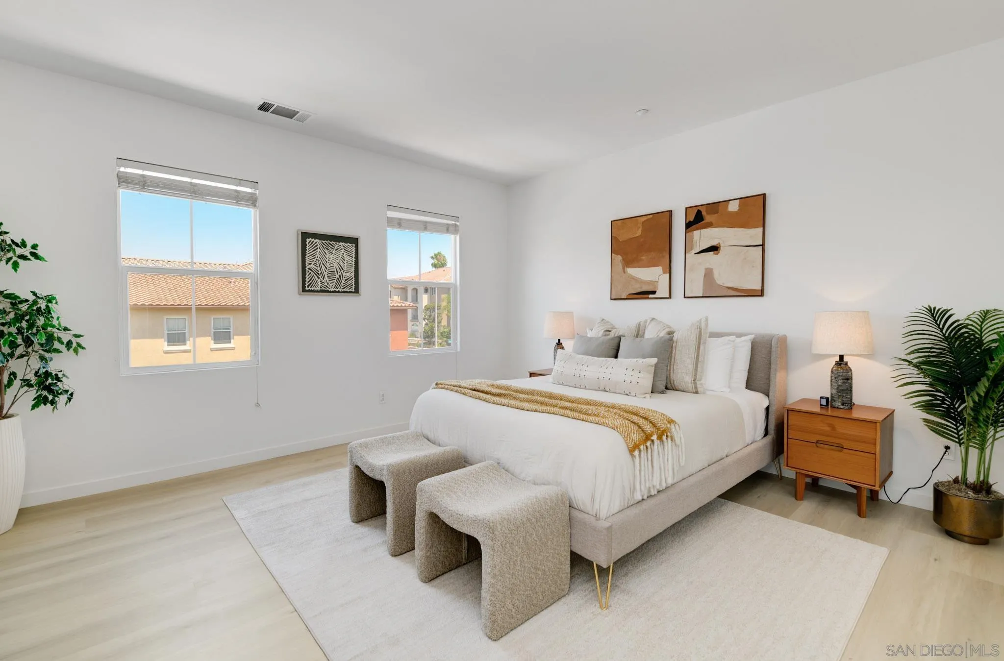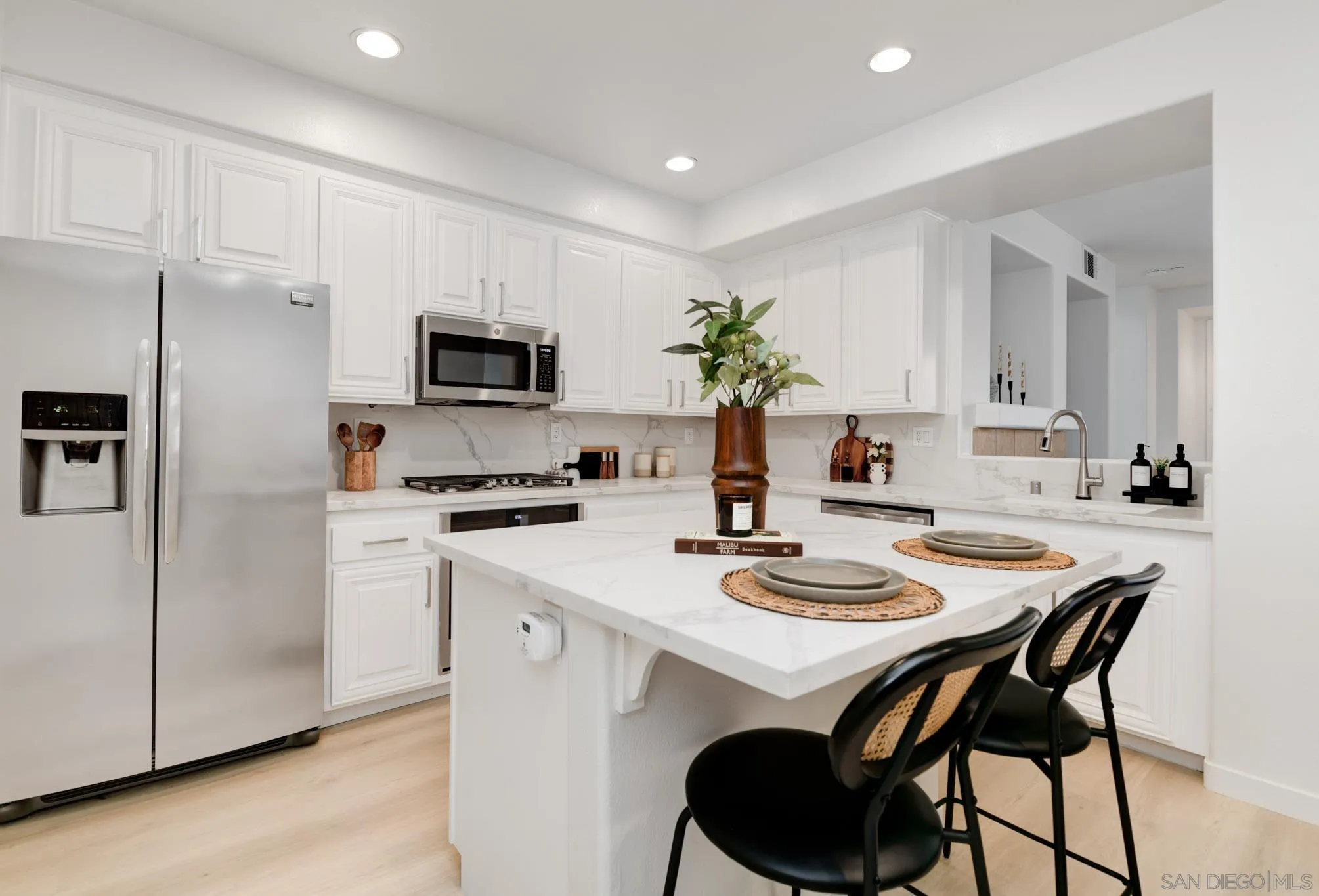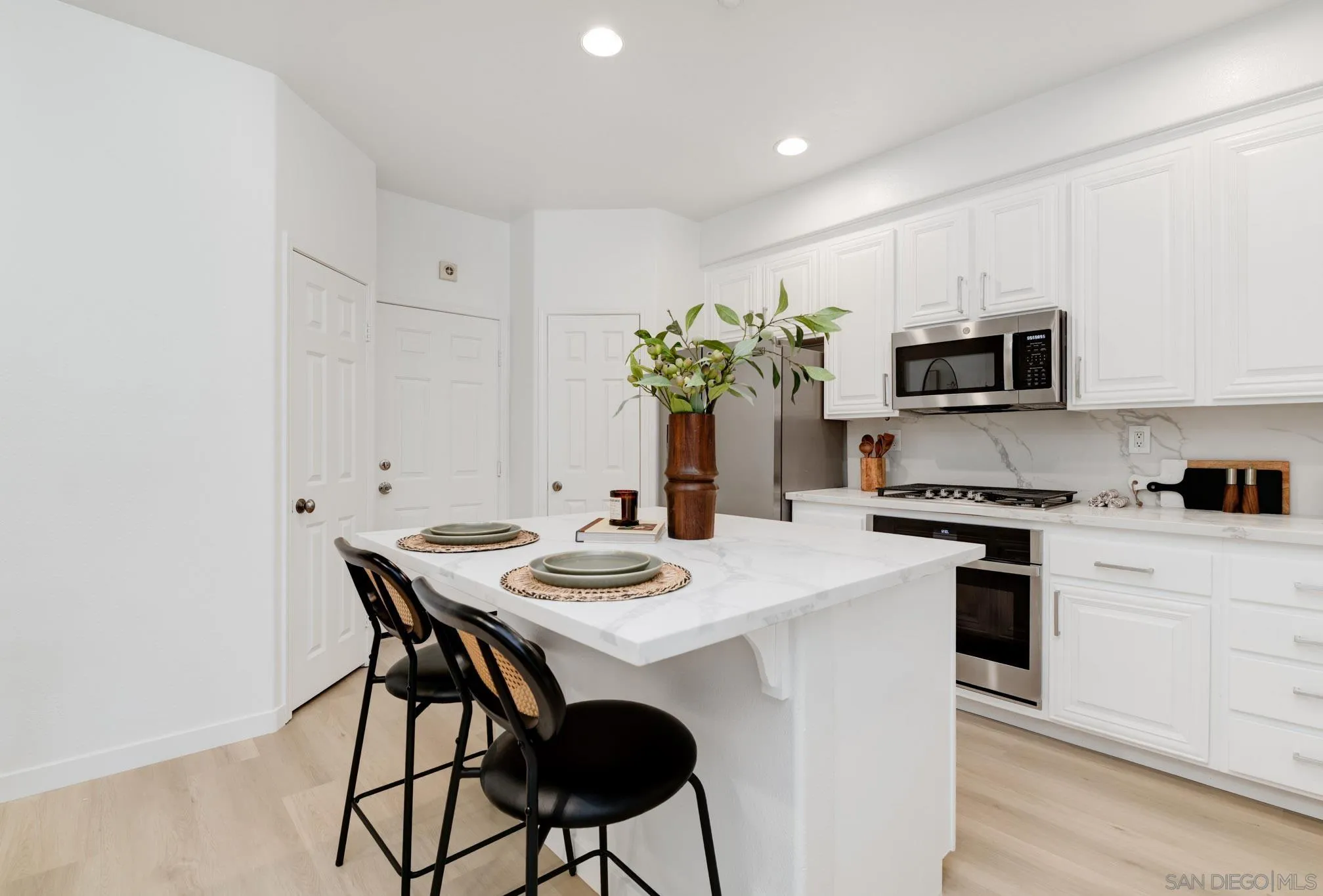 AVAILABLE NOW! NEWLY REMODELED. 8 MONTH RENTAL. Brand new appliances, sparkling white quartz counter tops in kitchen/baths wide plank modern LVP flooring and many more upgrades. Welcome to 7895 Via Montebello, a beautifully renovated townhome in the highly sought-after Cortina community of Torrey Highlands. This spacious two-bedroom, two-and-a-half-bath residence has been thoughtfully upgraded by its original owner to reflect a clean, contemporary aesthetic. Airy interiors are enhanced by wide-plank LVP flooring, a custom white oak staircase, and refined finishes throughout. The kitchen is a true showpiece, featuring sleek quartz countertops, a full-height backsplash, an eat-in island, a spacious double pantry, and upgraded stainless steel appliances including a GE Smart Convection Oven and GE Profile cooktop all anchored by a striking Blanco sink. Bathrooms have also been elevated with quartz surfaces, modern lighting, new fixtures, custom mirrors, and frameless glass shower enclosures. Enjoy a large entry patio ideal for outdoor entertaining, and a rare two-car garage an upgrade over many neighboring units. The Cortina community also offers access to a beautifully maintained pool, spa, and clubhouse for residents to enjoy. Perfectly situated just a short walk from shopping, dining, and minutes from the 56 freeway, this turnkey home offers effortless access to all that North County San Diego has to offer within a tranquil, private community setting.