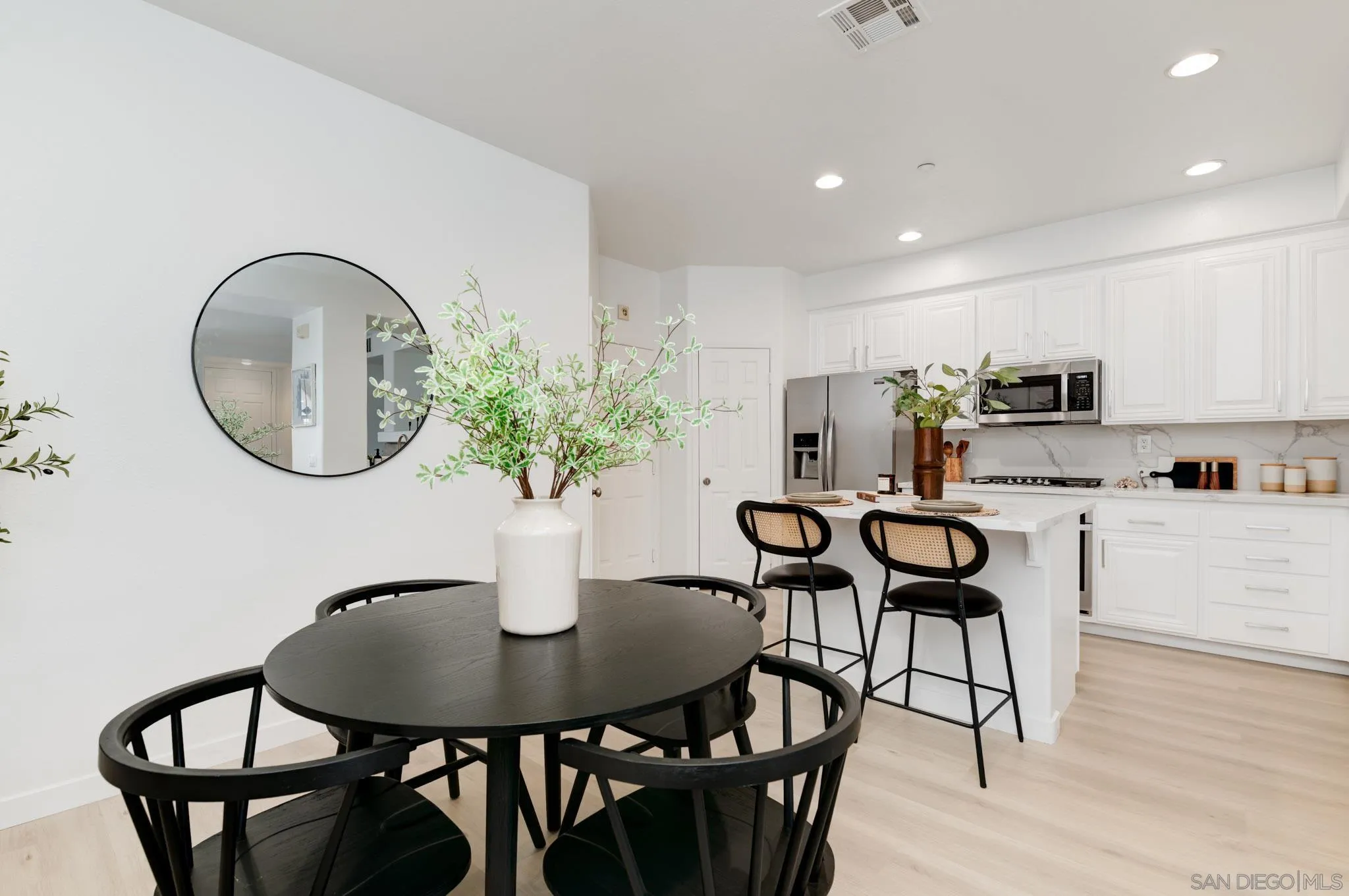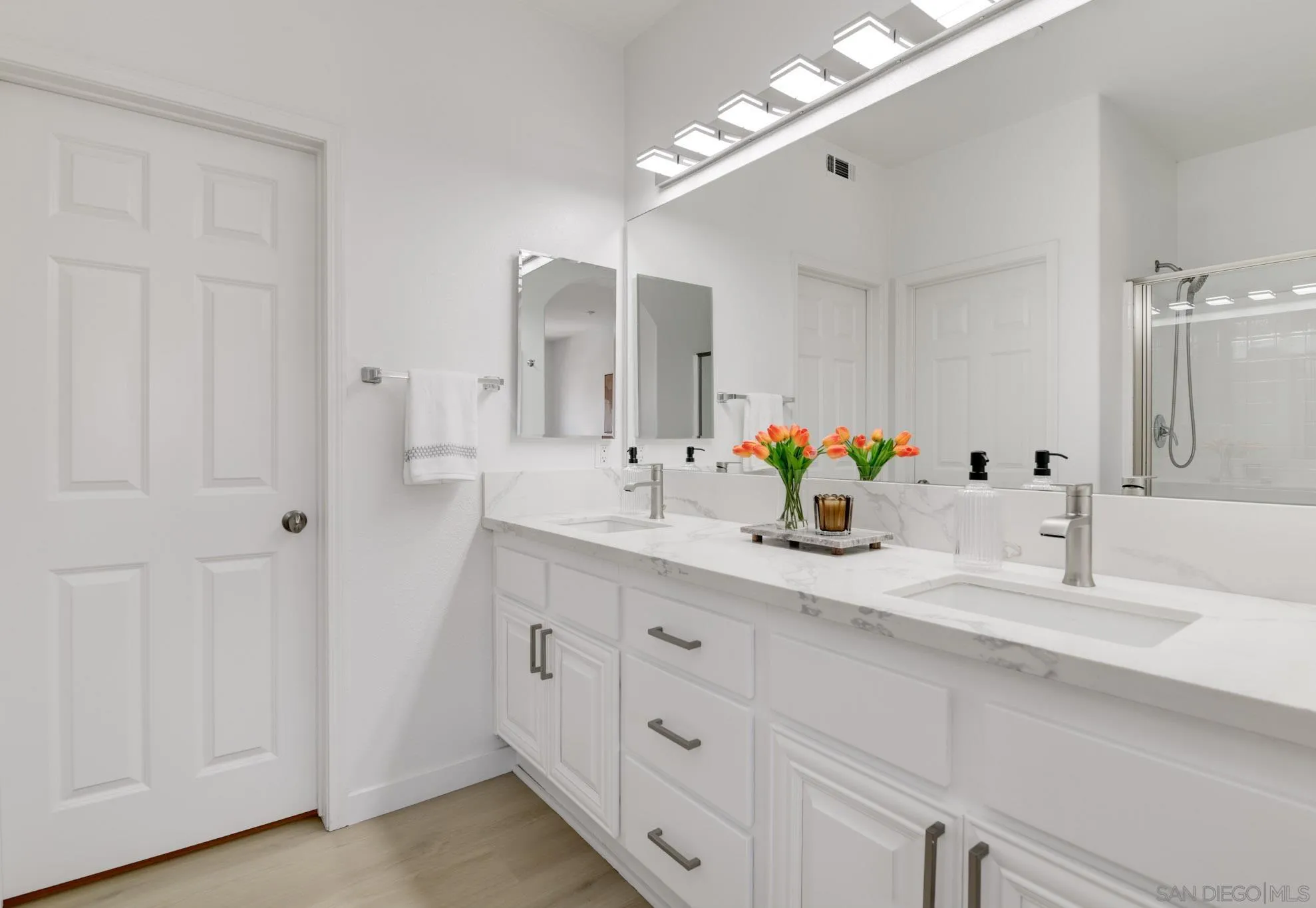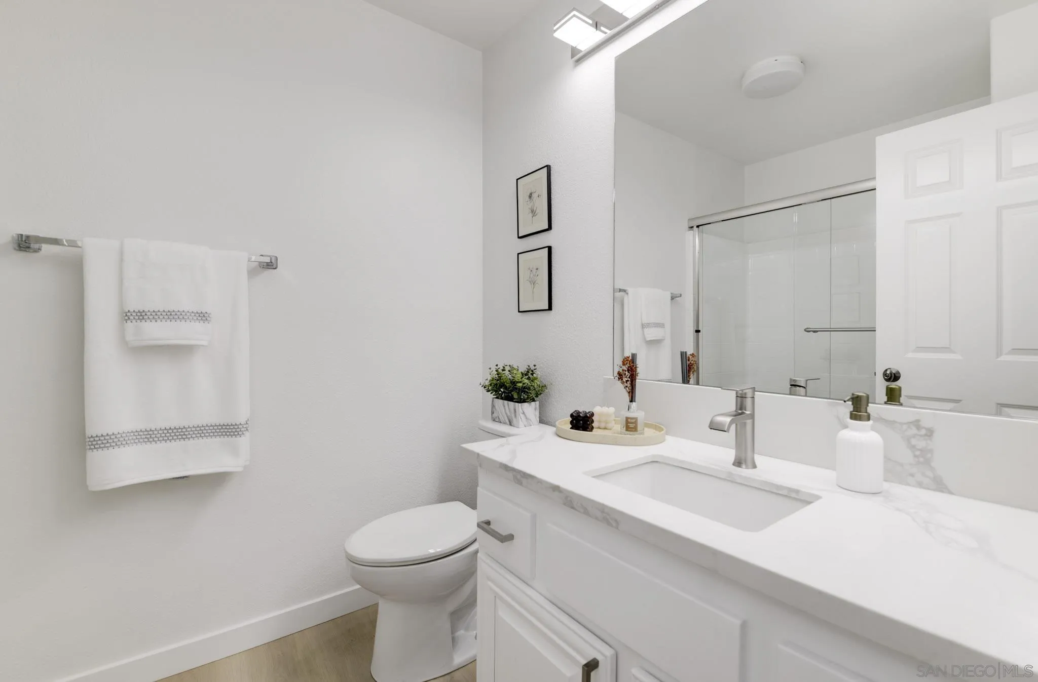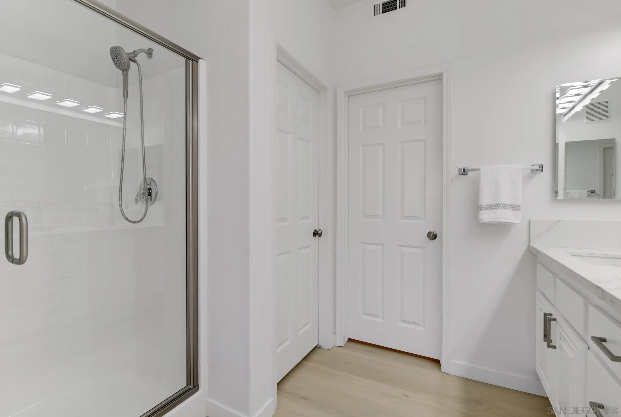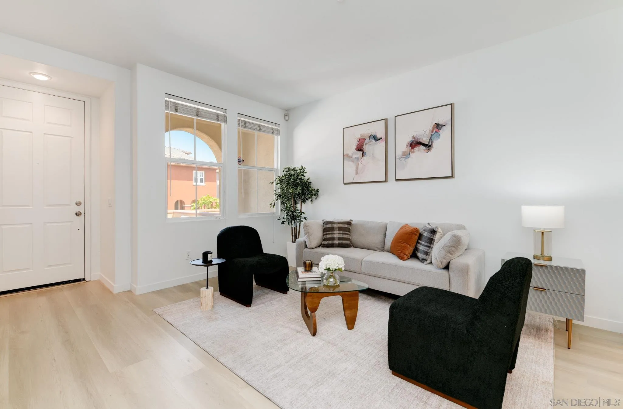 AVAILABLE NOW! NEWLY REMODELED. 8 MONTH RENTAL. Brand new appliances, sparkling white quartz counter tops in kitchen/baths wide plank modern LVP flooring and many more upgrades. Welcome to 7895 Via Montebello, a beautifully renovated townhome in the highly sought-after Cortina community of Torrey Highlands. This spacious two-bedroom, two-and-a-half-bath residence has been thoughtfully upgraded by its original owner to reflect a clean, contemporary aesthetic. Airy interiors are enhanced by wide-plank LVP flooring, a custom white oak staircase, and refined finishes throughout. The kitchen is a true showpiece, featuring sleek quartz countertops, a full-height backsplash, an eat-in island, a spacious double pantry, and upgraded stainless steel appliances including a GE Smart Convection Oven and GE Profile cooktop all anchored by a striking Blanco sink. Bathrooms have also been elevated with quartz surfaces, modern lighting, new fixtures, custom mirrors, and frameless glass shower enclosures. Enjoy a large entry patio ideal for outdoor entertaining, and a rare two-car garage an upgrade over many neighboring units. The Cortina community also offers access to a beautifully maintained pool, spa, and clubhouse for residents to enjoy. Perfectly situated just a short walk from shopping, dining, and minutes from the 56 freeway, this turnkey home offers effortless access to all that North County San Diego has to offer within a tranquil, private community setting.